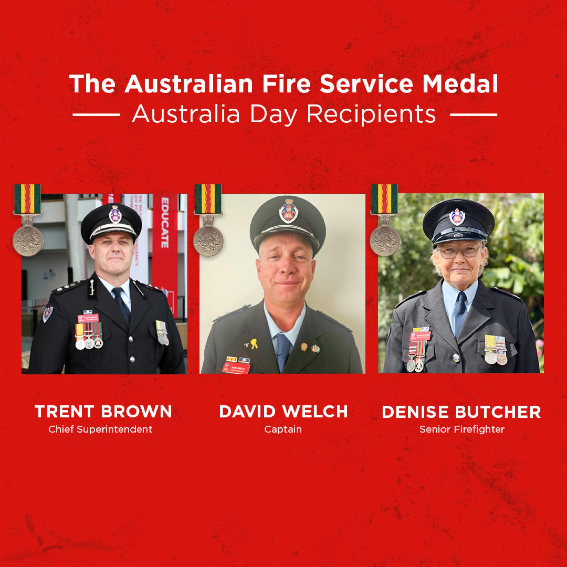 The highest national honour for Australian firefighters was awarded to Chief Superintendent Trent Brown, Captain David Welch and Senior Firefighter Denise Butcher.